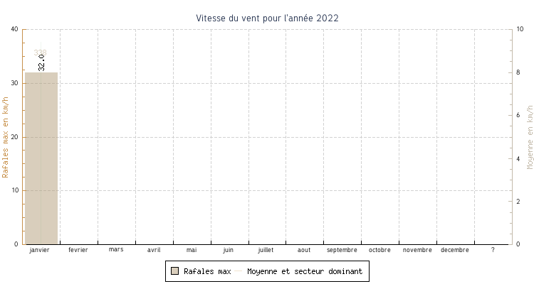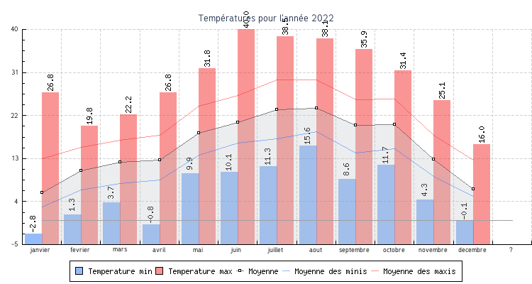 | janvier | -2.8 °C | 2.8 °C | 26.8 °C | 13.0 °C | 5.9 °C | 0.0 km/h | 32.0 km/h | 338 |