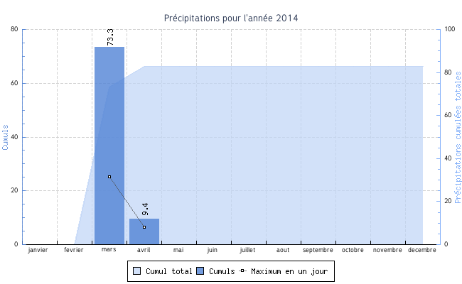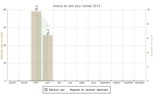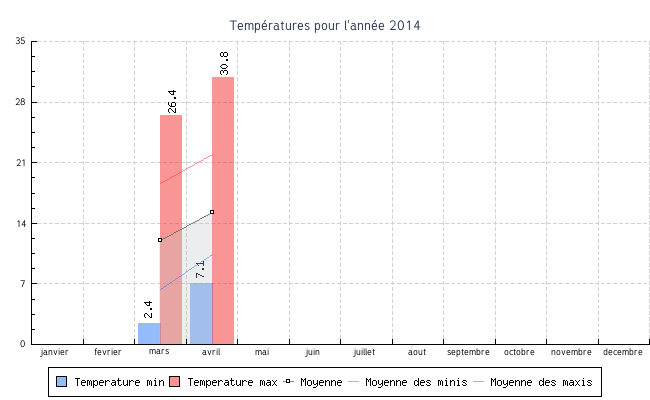 | avril | 7.1 °C | 10.4 °C | 30.8 °C | 21.9 °C | 15.2 °C | 8.3 km/h | 51.1 km/h | ONO |